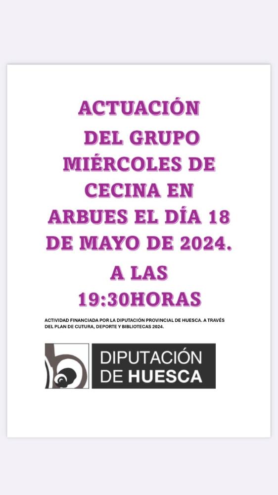 ACTUACIÓN MIERCOLES DE CECINA EN ARBUES Whatsapp: ACTUACIÓN MIERCOLES DE CECINA EN ARBUES Fecha 13 mayo 2024 Actuación miércoles de cecina en Arbues día 18 de mayo. Actuación miércoles de cecina en Arbues día 18 de mayo. Actividad financiada por la Diputación Provincial de Huesca. Galería imágenes